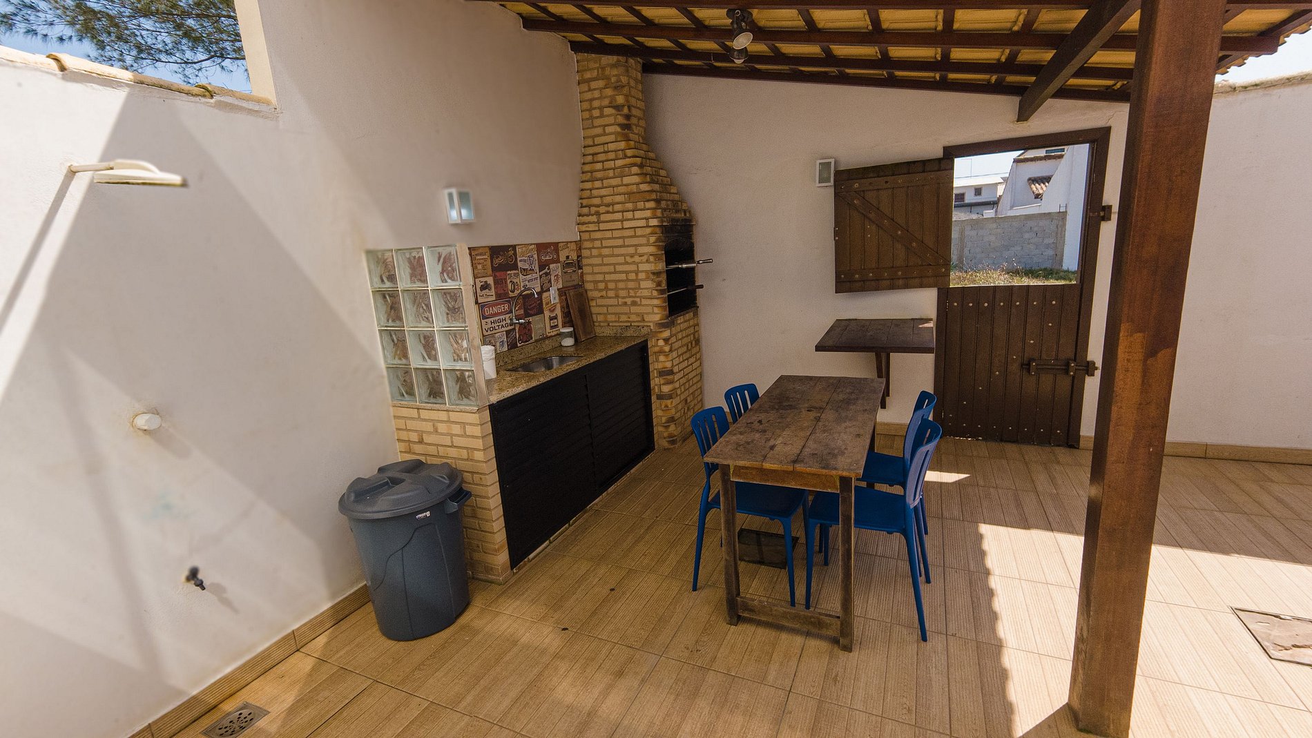 E a churrasqueira, coladinha à cozinha, é o lugar perfeito para a resenha depois praia.