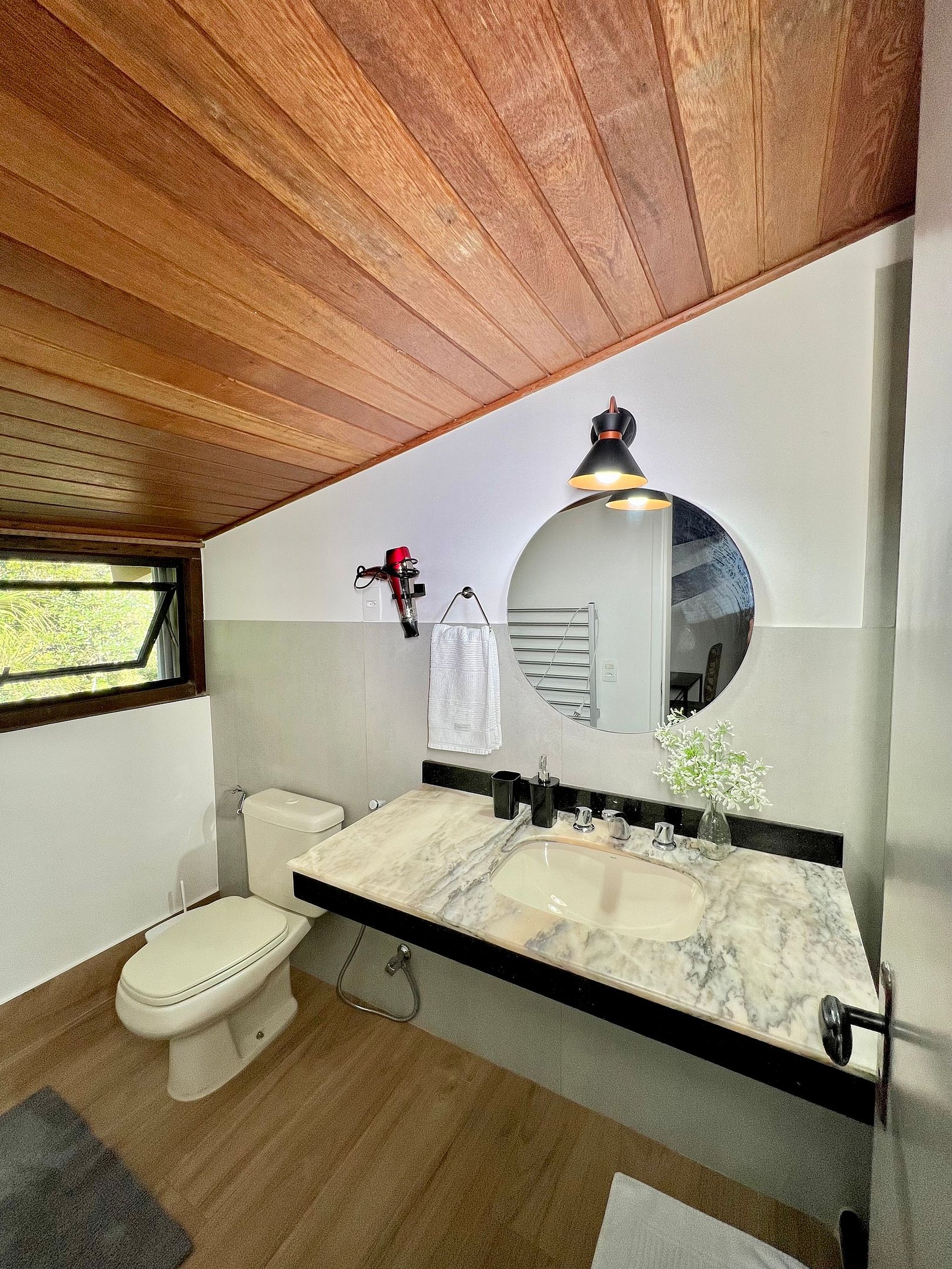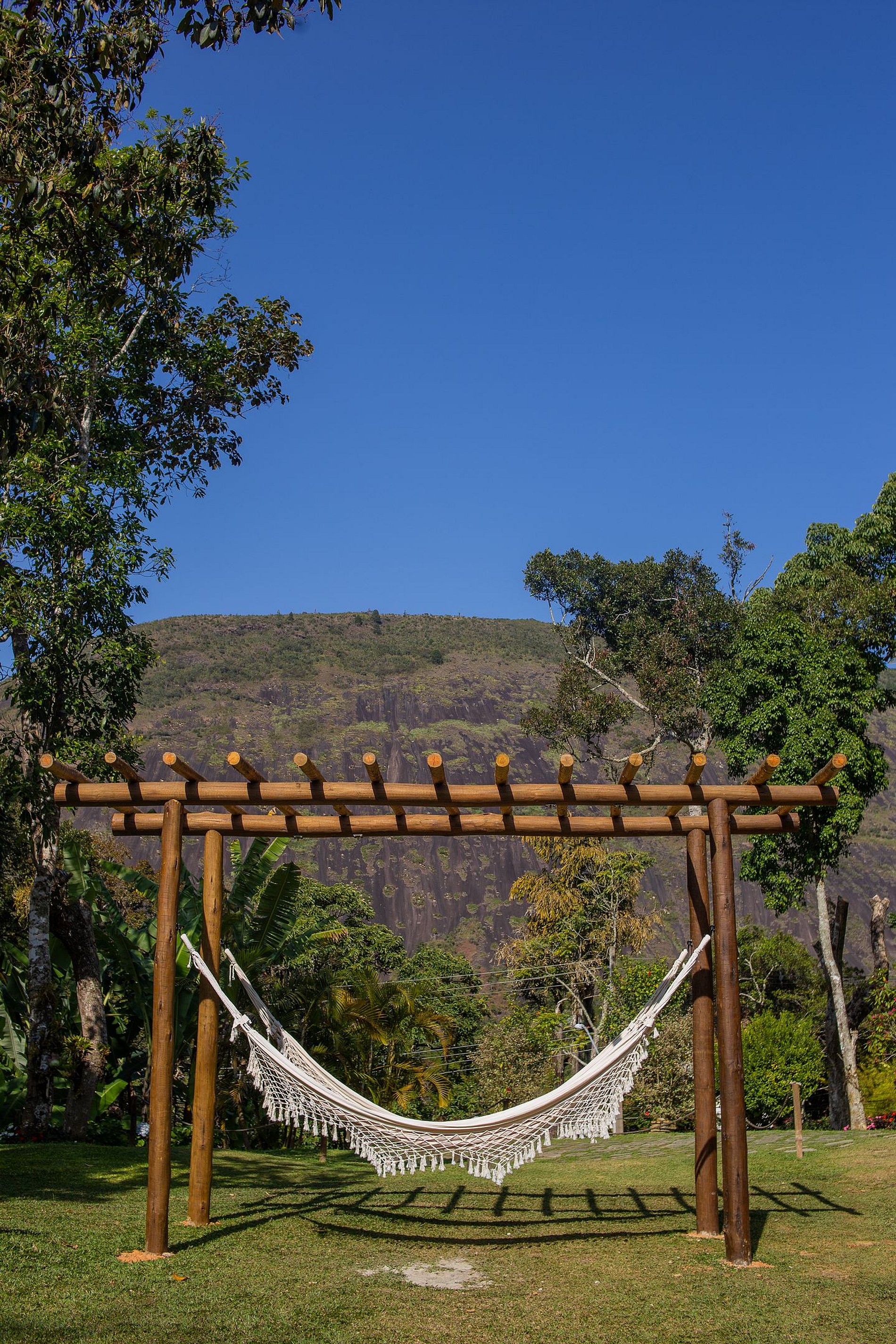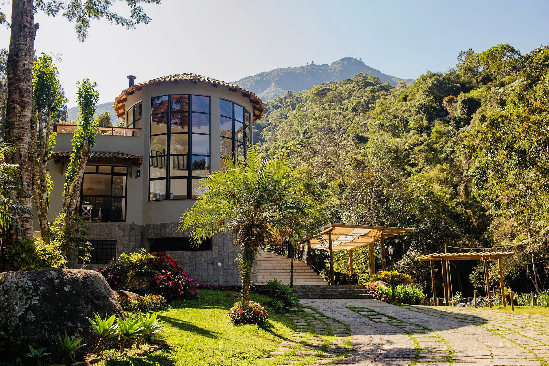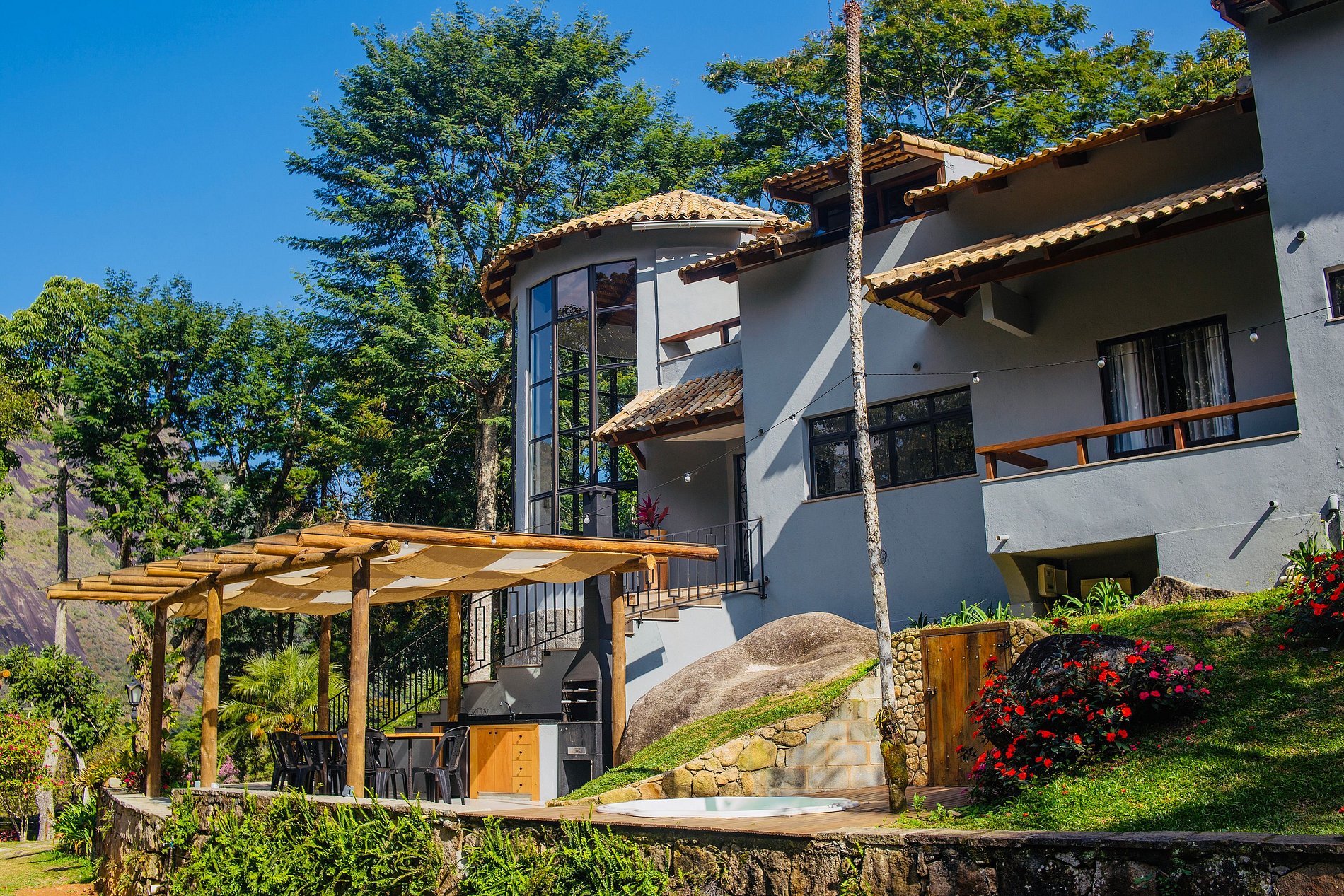 Na mesma casa: Cachoeira e piscina natural no quintal; e também spa aquecido e gramadão colado na churrasqueira; e também área interna super integrada (cozinha + sala de jantar + sala da lareira + sala da sinuca em único ambiente); e com 7 suítes + 1 quarto que acomodam a turma toda (até 22); Apenas 1:30 h do Rio; E a lindíssima vista da Pedra do Oratório em frente à Torre