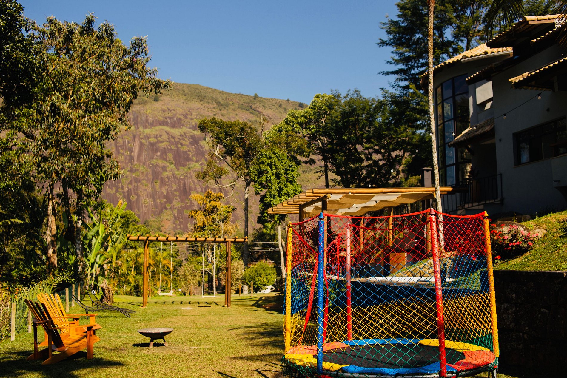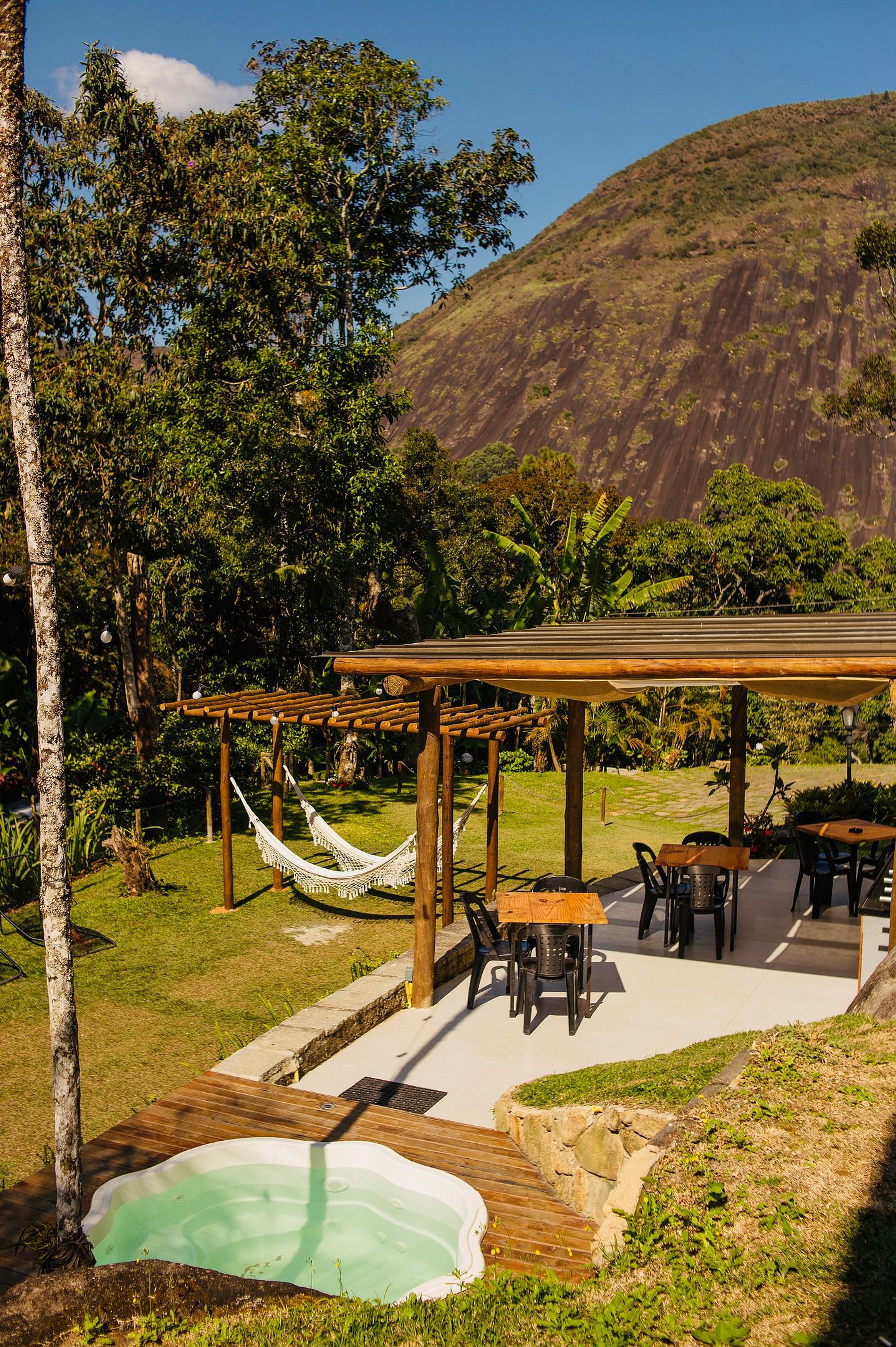 ÁREA DE LAZER EXTERNA: A área externa conta com churrasqueira, spa aquecido, riacho, piscina natural, cachoeira, jardim e lareira portátil para uma fogueira. Tudo muito pertinho, sem precisar pegar trilha. A churrasqueira é coladinha na casa pra turma da churrasqueira não ficar longe da turma da sinuca ou da cozinha. No gramadão entre a churrasqueira e a cachoeira tem rede de vôlei, pula pula (crianças apenas), redário, balanços e dois golzinhos.