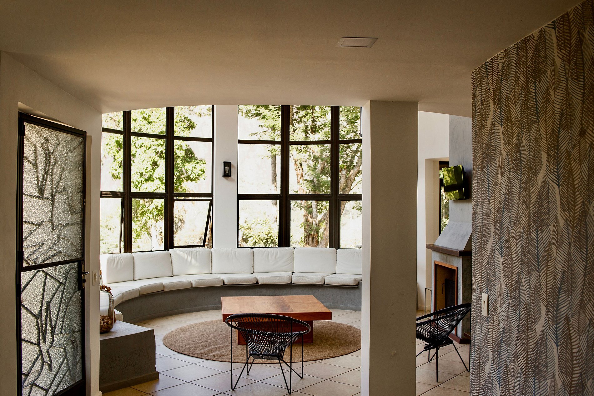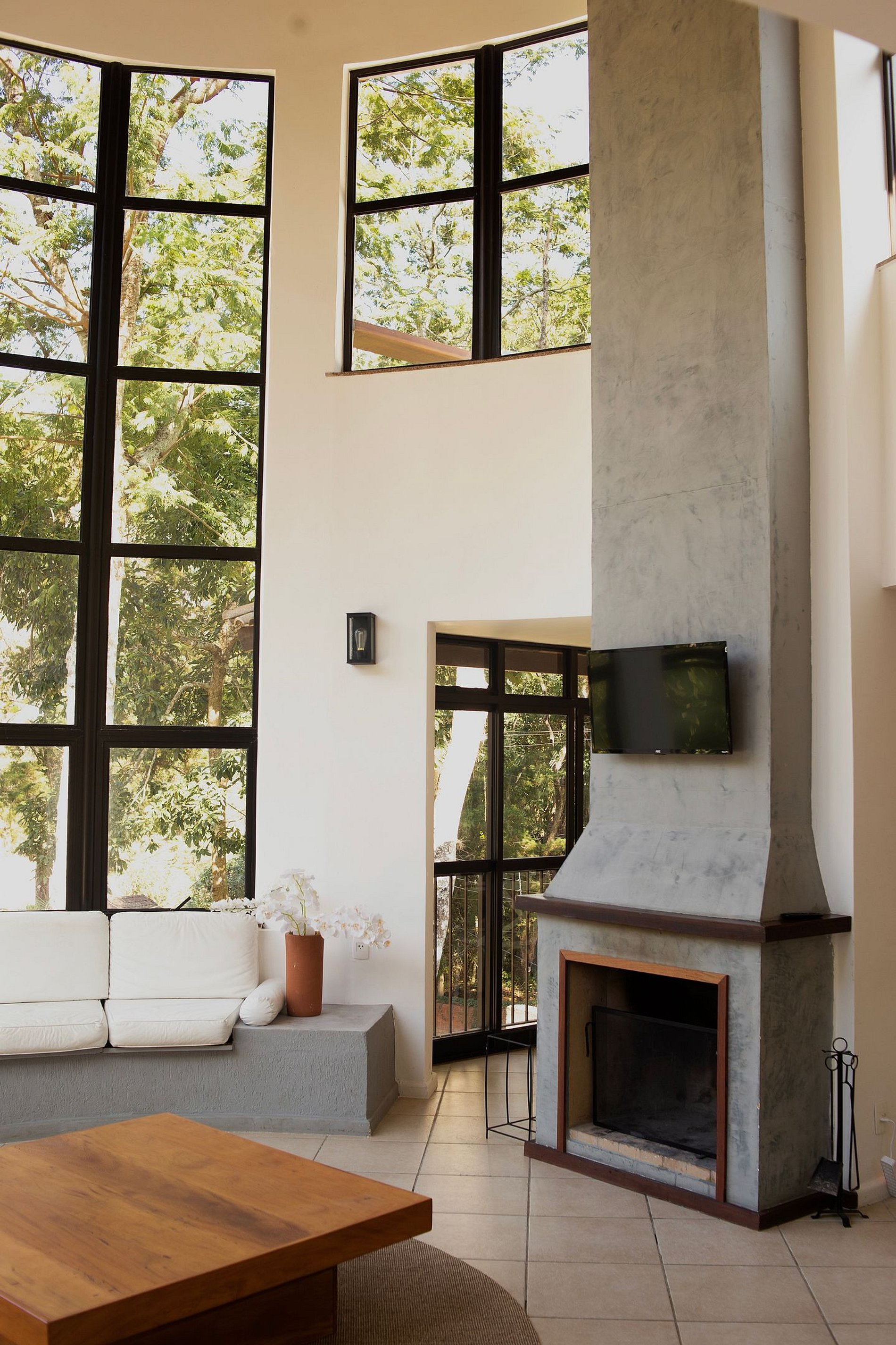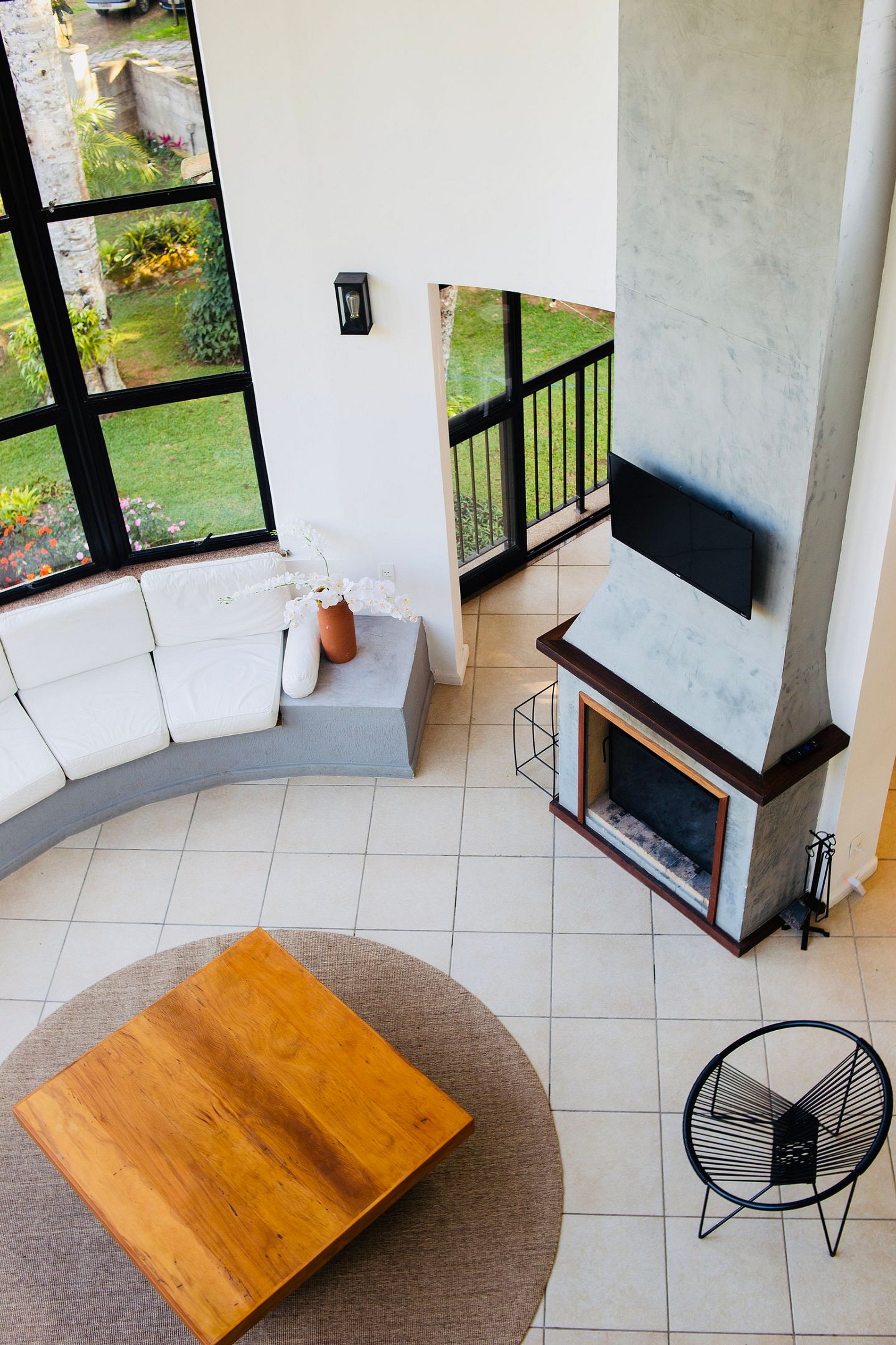 Somente a sala de TV é separada, no segundo andar, para ter menor interferência entre quem quer ver TV e a conversa animada que certamente estará acontecendo no primeiro andar. OBS: também tem uma TV por cima da lareira, pensada para o caso de ser difícil para alguém da família subir escadas na hora da novela.