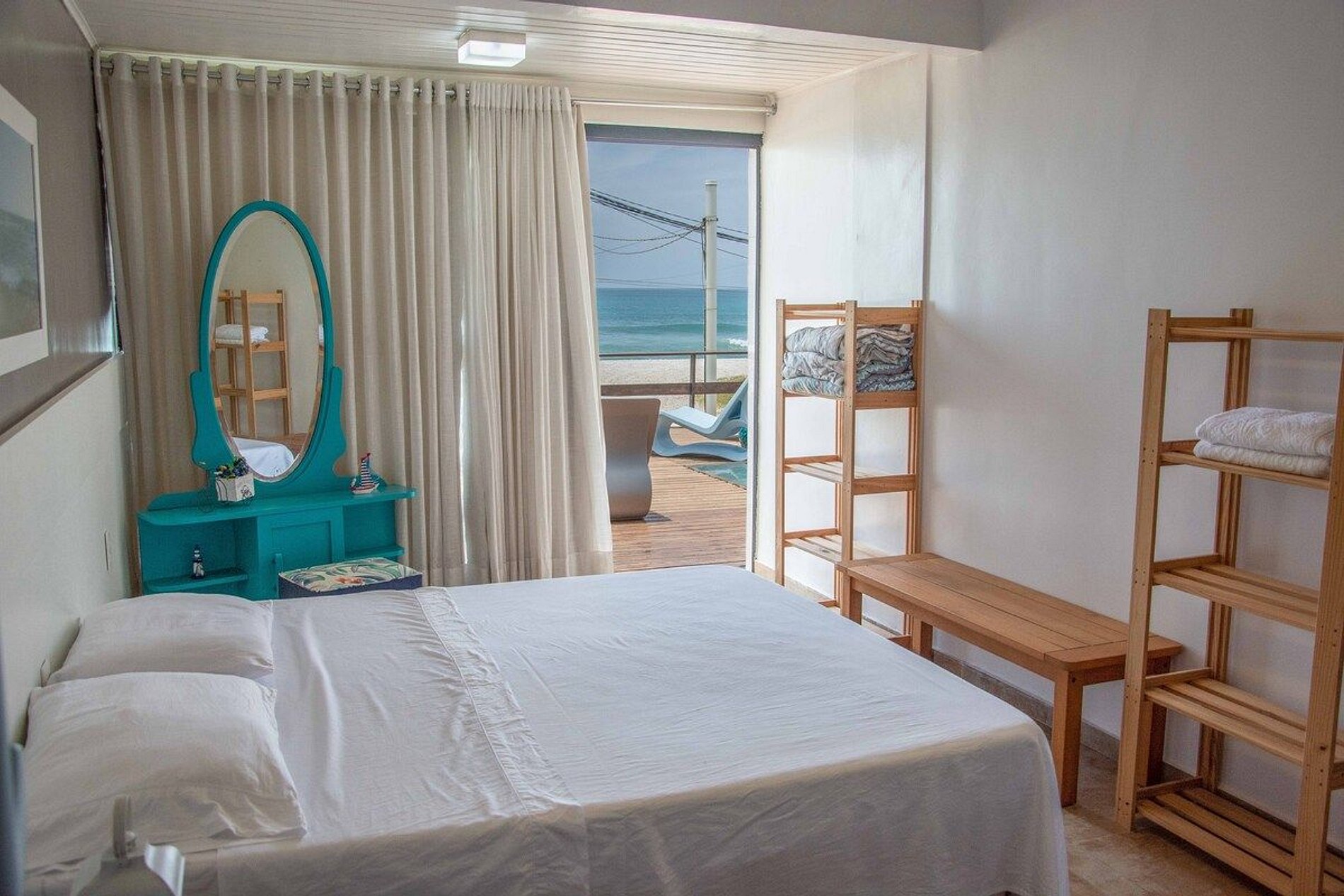 - O quarto #4 é uma suíte de frente para o mar. Tem uma cama Queen e duas camas auxiliares de solteiro (daquelas tipo gaveta). Fica no segundo andar, e tem saída direto para o deck;