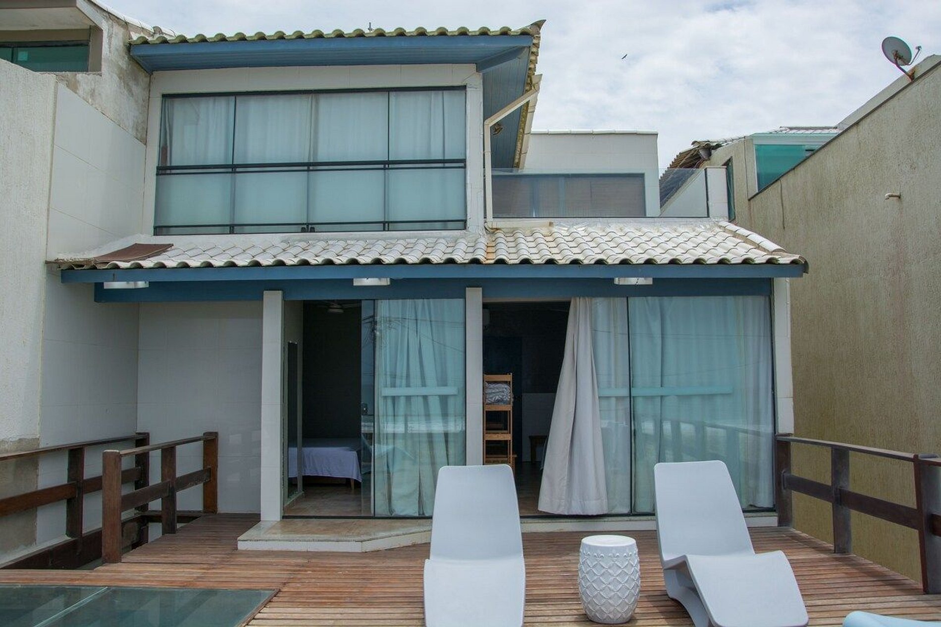 - No quarto #3 é de frente para o mar. Tem uma cama Queen e uma cama de solteiro. Fica no segundo andar, , e tem saída direto para o deck;