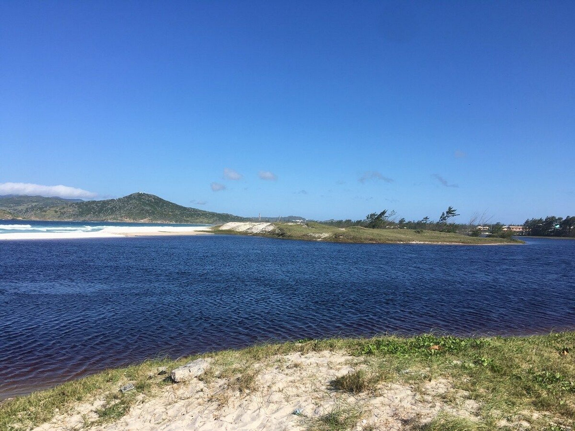 A junção da lagoa com o mar é uma experiência única de praia: ter mar azul de um lado da areia e lagoa calminha do outro.